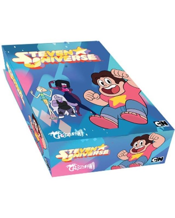 Steven Universe y las Gemas de Cristal es un juego de cartas que se compone de 58 cartas de personaje, donde se encuentra el propio Steven, a Las Gemas y a un montón de personajes del pueblo donde se desarrolla la historia: Beach City. Aparte de estas cartas, hay 12 cartas de misiones y otras 12 de zona, divididas en tres tipos. Por último os encontraréis 4 cartas resumen o recuerdos.