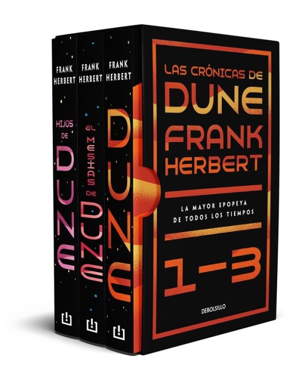 Un estupendo estuche con la trilogía original de Frank Herbert, considerada la mayor epopeya de ciencia ficción de todos los tiempos, compuesta por Dune, Mesías de Dune e Hijos de Dune. En un futuro lejano, en un planeta remoto, se libra una compleja lucha que tendrá repercusiones en toda la galaxia. En las arenas del desértico planeta Akarris, más conocido como Dune, aprender a sobrevivir no es suficiente... Estamos ante una saga apasionante que plantea por primera vez de forma completa, racional y convincente todo un mundo independiente del nuestro. Sin embargo, sus referencias a los problemas ecológicos, el poder de las drogas y la fuerza de los mitos la han convertido en una obra de culto para millones de lectores en todo el mundo. Este estuche contiene los volúmenes: 1. Dune 2. El mesías de Dune 3. Hijos de Dune